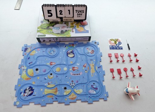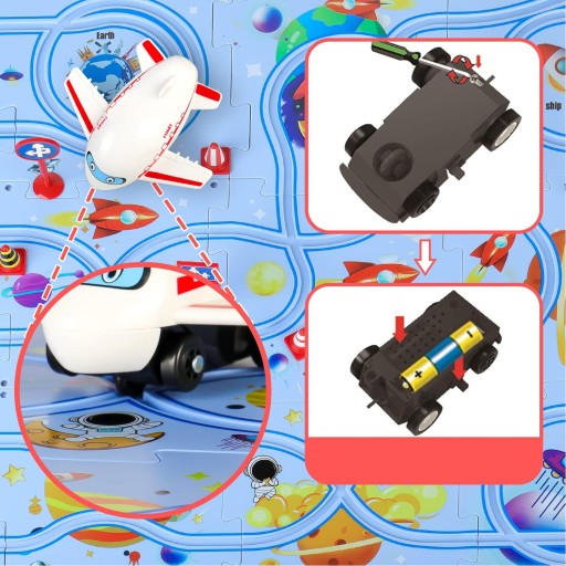 ten zestaw zabawek dla dzieci wymaga od małych dzieci ułożenia elementów układanki w określonym kierunku, aby samochodzik jechał po torze.