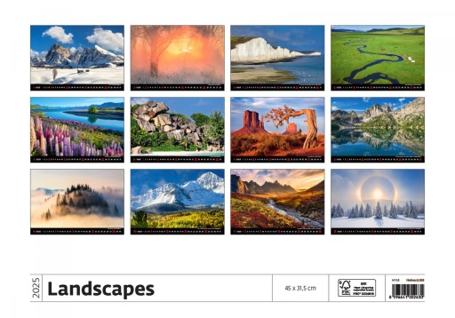 Landscapes 2025 to wieloplanszowy kalendarz ścienny ze zdjęciami urzekających krajobrazów. Piękne starannie dobrane zdjęcia tworzą niesamowitą kompozycję barw i nastojów. Duży format (plansze kalendarza mają 45 cm szerokości i 31,5 cm wysokości) oraz poziomy układ wyróżnia Landscapes wśród innych kalendarzy.