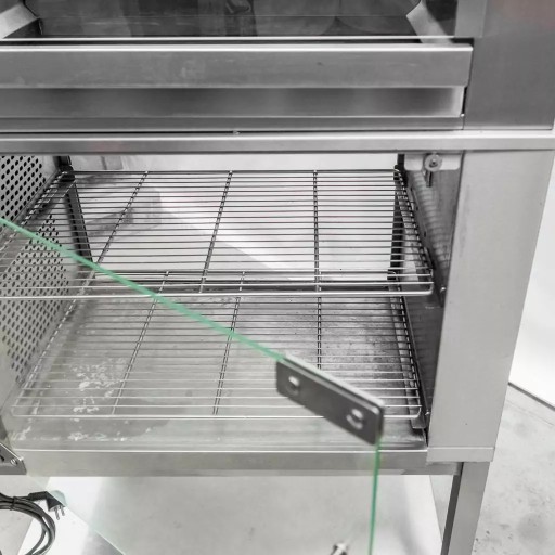 - Obsługa – łatwe sterowanie mechaniczne. Płynna regulacja temperatury rożna w zakresie od 50 do 250°C, szafki grzewczej od 0 do 90°C. Dodatkowo wyposażony w sygnalizator gotowości do pracy.