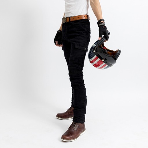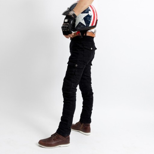 Spodnie motocyklowe o bardzo oryginalnym kroju w stylu bojówek. Wysoki poziom bezpieczeństwa panelu z kevlaru oraz ochrony kolan. Bardzo solidne, mocne i bezpieczne jeansy, które jednocześnie są wysokiej jakości.