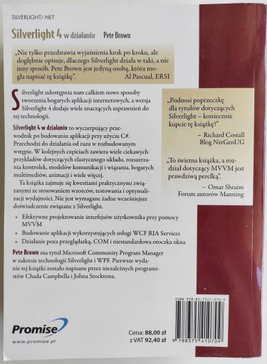 Silverlight udostępnia nam całkiem nowe sposoby tworzenia bogatych aplikacji internetowych, a wersja Silverlight 4 dodaje wiele znaczących usprawnień do tej technologii. Silverlight 4 w działaniu to wyczerpujący przewodnik po budowaniu aplikacji przy użyciu C#.