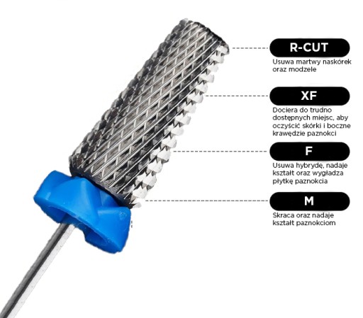 Dzięki tym 4 gradacjom można szybko i łatwo oczyścić skórki i paznokcie, usunąć martwy naskórek, wygładzić paznokcie oraz nadać im kształt, usunąć akryl, żel oraz hybrydę z paznokci bez konieczności zmiany frezu.