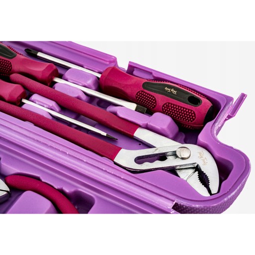 - Poręczny organizer - zestaw narzędzi zamknięty w wygodnym, różowym kufrze z miejscem na każdy element, co ułatwia przechowywanie oraz transport.