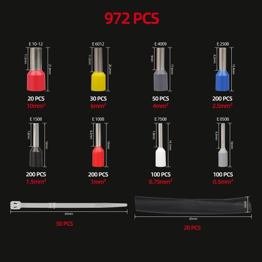 Pakiet zawiera: Samonastawne narzędzie do zaciskania przewodów, 1270szt wysokiej jakości końcówek do zaciskania przewodów oraz Mini Wire Stripper.
