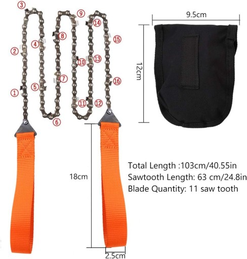 WYSOKA JAKO rczna pia ańcuchowa wykonana jest z wysokiej jakoci stali manganowej i grubej nylonowej rkojeci która jest ostra wytrzymaa i trwaa i moe by uywana przez dugi czas. WYSOKA WYDAJNO Kieszonkowa pia ańcuchowa ma szybk i wydajn zdolno cicia moe szybciej ci mae gazie i due pnie drzew i jest bardzo wygodna w uyciu. ODPOWIEDNI DLA Skadana pia ańcuchowa Survival przyjmuje dobrze wywaon i niskowibracyjn konstrukcj. Jest bardzo odpowiedni do cicia drewna w sytuacjach survivalowych takich jak obozowicze turyci z plecakami rybacy i wdrowcy. ATWY W UYCIU Uyj piy aby wykona elastyczny wze na przedmiocie tncym poó kciuki po obu stronach piercienia i wykonaj nacicie w ksztacie litery V aby pocign w przód iw ty. LEKKA I PRZENONA Pia kempingowa jest skadana jest bardzo lekka i przenona zajmuje tylko niewielk przestrzeń i jest bardzo dobrym narzdziem przetrwania.