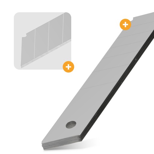 Wykonane z wysokowęglowej stali, gwarantują trwałość i precyzję cięcia. Ich segmentowa budowa pozwala na stałe utrzymanie ostrej krawędzi – wystarczy odłamać zużyty segment, aby odsłonić nowy, ostry fragment ostrza. Dzięki temu, ostrza te doskonale sprawdzają się w nożach uniwersalnych, idealnych do cięcia tapet i innych miękkich materiałów, takich jak karton, guma, styropian, korek, czy skóra.