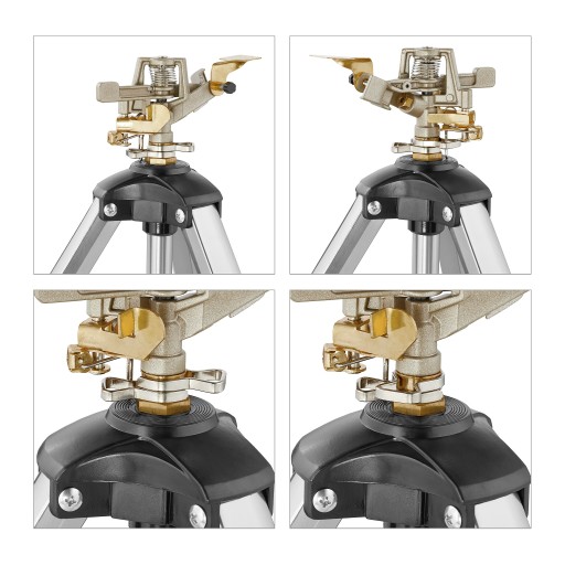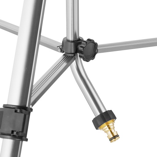 Maks. wymiary wys. x szer. x gł.: ok. 121 x 125 x 108 cm Wymiary przestrzeni magazynowej wys. x szer. x gł.: ok. 65 x 16 x 12 cm Zasięg L: ok. 12-18 m Sektory: do 360° Waga : ok. 2 kg Materiał: aluminium, mosiądz, tworzywo sztuczne W kolorze srebrnym Do nawadniania po pełnym okręgu złóż zacisk mocujący do góry Jeśli chcesz nawodnić sekcję, złóż zacisk mocujący w dół Ustaw liczbę stopni, przesuwając śruby regulacyjne powyżej siebie. Reguluj zasięg za pomocą klapki przed dyszą 10046957