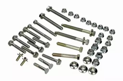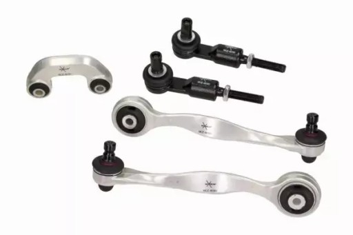 Pełen komplet wahaczy zawieszenia przedniego - 8 sztuk - Lewy górny przedni - Lewy górny tylny - Prawy górny przedni - Prawy górny tylny - Lewy dolny przedni - Lewy dolny tylny - Prawy dolny przedni - Prawy dolny tylny Łączniki stabilizatora - 2 sztuki - Lewy - Prawy Końcówki drążka kierowniczego - 2 sztuki - Lewa - Prawa Zestaw wzmocnionych śrub oraz nakrętek