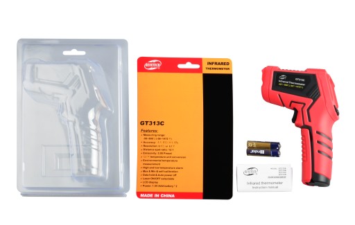 Wysokiej jakości termometr bezkontaktowy marki Benetech o zakresie temperatur od -50 do +800 °C. Urządzenie wyposażone jest w celownik laserowy, który umożliwia precyzyjne nacelowanie badanego punktu. W urządzeniu zastosowano dobrej jakości materiały, a ergonomiczna budowa poprawia wygodę użytkowania termometru. Podświetlany KOLOROWY wyświetlacz umożliwia pracę z urządzeniem w ciemności. Pirometr wyposażony jest w funkcję automatycznego wyłączenia zwiększając oszczędność w zużyciu baterii.