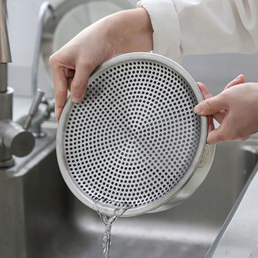 3. Wszechstronna konstrukcja: Zestaw umywalek z durszlakem ze stali nierdzewnej może być używany do odsączania, mycia, mieszania i innych celów i jest niezbędnym narzędziem w Twojej kuchni.