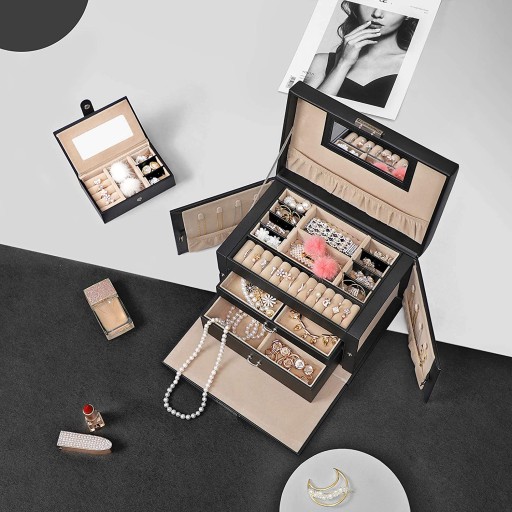 - Co jest w tym pudełku? W tym dużym pudełku na biżuterię o wymiarach 26 x 17 x 18 cm znajdują się 2 szuflady, 2 boczne przegródki na naszyjniki i wiele przegródek na pierścionki i inne akcesoria. W ten sposób oszczędzasz nie tylko miejsce, ale także czas na irytujące poszukiwanie biżuterii.