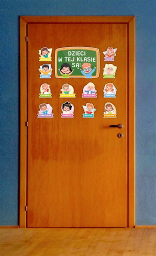 Zestaw składa się z 13 kolorowych elementów - 1 dużej tabliczki z napisem "DZIECI W TEJ KLASIE SĄ:" i 12 mniejszych elementów z dziećmi oraz cechami.
