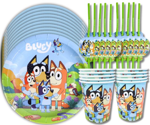 - W ZESTAWIE: 10 sztuk talerzyków + 10 sztuk kubków papierowych + 10 sztuk słomek plastikowych z papierową zawieszką + 20 sztuk serwetek z bohaterami bajki Bluey,