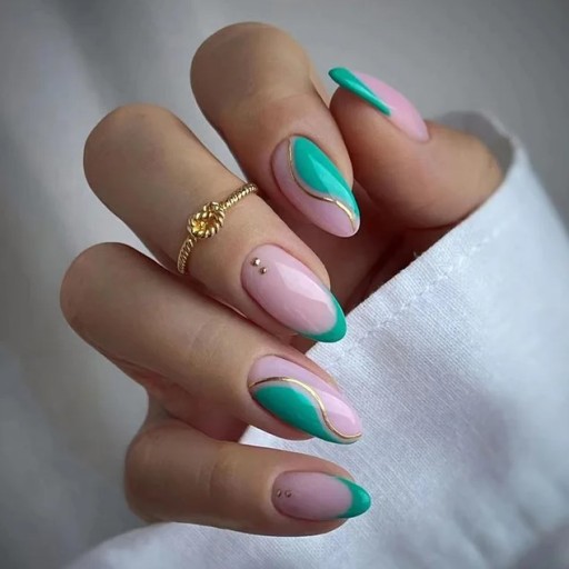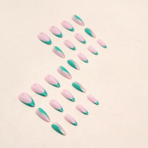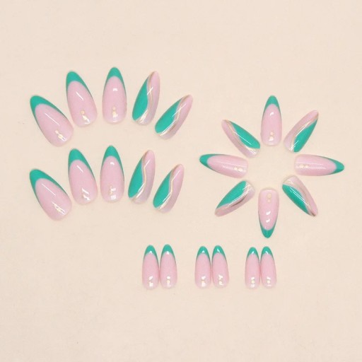 ✔️ Tipsy gotowe paznokcie almond. Naklejane sztuczne paznokcie żelowe kolorowe. Sztuczne paznokcie zdobione w kolorze delikatnego różu ze zdobieniem french w kolorze zielonym oraz ze złotymi akcentami. Doklejane paznokcie kolorowy french. Sztuczne paznokcie złoty swirl.