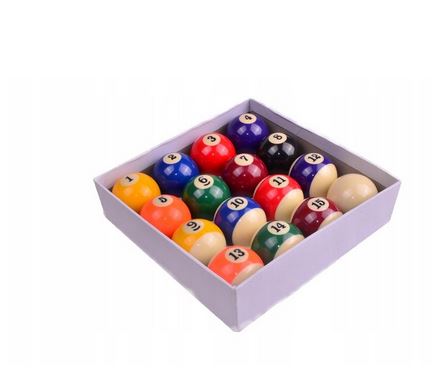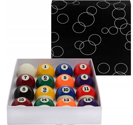 Komplet 16 standardowych bil do bilarda o średnicy 57,2 mm.