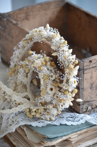 Piękny, rustykalny zestaw w naturalnych kolorach. Może być to wianek dla Panny Młodej, druhen, świadkowej czy starszych dziewczynek.