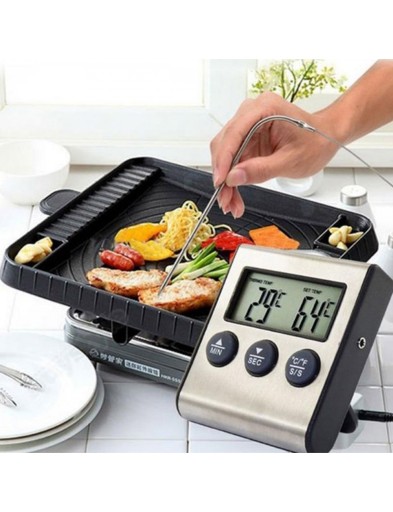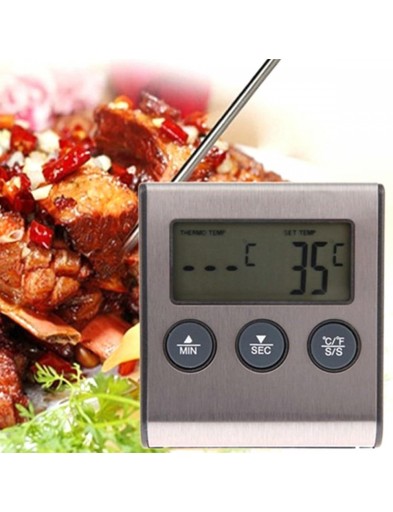 Elektroniczny termometr LCD służący do mierzenia temperatury mięs, cieczy, ciasta, czy też grilla. Pozwoli na wygodną kontrolę temperatury gotowanej potrawy podczas przygotowywania oraz odmierzenie pozostałego czasu.