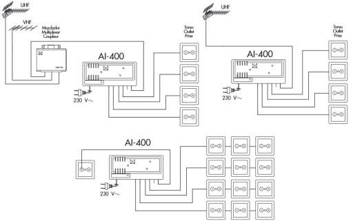Szerokopasmowy wzmacniacz mieszkaniowy do telewizji naziemnej z wbudowanym zasilaczem. Wzmacnia oddzielnie pasma VHF i UHF i ma niezależną kontrolę wzmocnienia dla każdego pasma. Zawiera cztery wyjścia umożliwiające dystrybucję do 4 lub więcej telewizorów. Wyjścia są równe lub niezbalansowane. Przeznaczony do powiększania analogowych i cyfrowych instalacji telewizji naziemnej w mieszkaniu lub domu. Wzmacnia sygnał telewizyjny, dzięki czemu dystrybucję z kilkoma nowymi gniazdami można wykonać z sygnału jednego gniazda telewizyjnego lub z kabla koncentrycznego wchodzącego do domu. Poziomy można łatwo regulować za pomocą dwóch regulatorów wzmocnienia.
