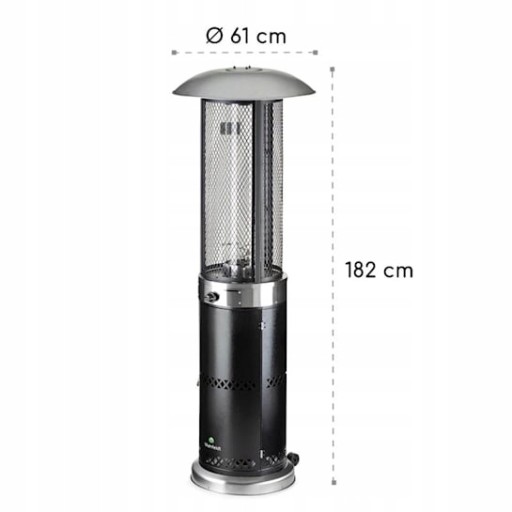 Skuteczny i energooszczędny. Promiennik parasolowy zasilany jest gazem z butli - płynnym propanem lub butanem w 11 kilogramowych butlach, bezpiecznie umieszczonych w przestronnym wnętrzu. Sprzęt ten łatwo jest uruchomić przy pomocy zintegrowanego zapłonu piezoelektrycznego. Wielostopniowe pokrętło pozwala na regulację dopływu gazu. Grzejnik gazowy wytwarza maks. moc cieplną 11,2 przy przepływie gazu 815 g / h. Bardzo duży parasol odbłyśnika o średnicy XX cm sprawia, że przyjemne ciepło nie ucieka do góry, lecz jest kierowane do najbliższego otoczenia i znajdujących się w nim osób. Imponujący w działaniu jest zwłaszcza cylinder palnika z przepływającym przez niego gorącym powietrzem, wykonany z nietłukącego szkła borokrzemowego. Płonie w nim jak pochodnia płomień gazowy, gwarantując imponujący optycznie, a zarazem bezpieczny spektakl z 360° FireView .