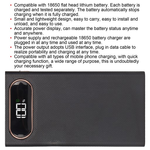 1. Zasilacz mobilny DIY: duża pojemność, baterie 12x18650 (brak w zestawie), podwójny zasilacz mobilny USB, umożliwia jednoczesne ładowanie 2 urządzeń. 3-częściowy port wejściowy z funkcją szybkiego ładowania, dowolne kable USB mogą ładować mobilne źródło zasilania. 2. Inteligentna ładowarka 18650: kompatybilna z baterią litową 18650 z płaską głowicą. Każdy akumulator jest ładowany i testowany oddzielnie. Bateria automatycznie przestaje się ładować, gdy jest w pełni naładowana. 3, łatwy w użyciu: mała i lekka konstrukcja, łatwa do przenoszenia, łatwa w instalacji i rozładunku oraz łatwa w użyciu. 4, wyświetlacz LCD: dokładny wyświetlacz mocy, może sprawdzić stan baterii w dowolnym miejscu i czasie. Przenośny zasilacz i ładowarka akumulatorów 18650 można podłączyć w dowolnym momencie i używać w dowolnym momencie. Moc wyjściowa przyjmuje interfejs USB, podłącz kabel do transmisji danych, aby zapewnić przenośność i ładowanie w dowolnym momencie. 5, szeroki cel: kompatybilny ze wszystkimi rodzajami ładowania telefonów komórkowych, z funkcją szybkiego ładowania, szerokim zakresem zastosowań, jest to niewątpliwie niezbędny prezent.