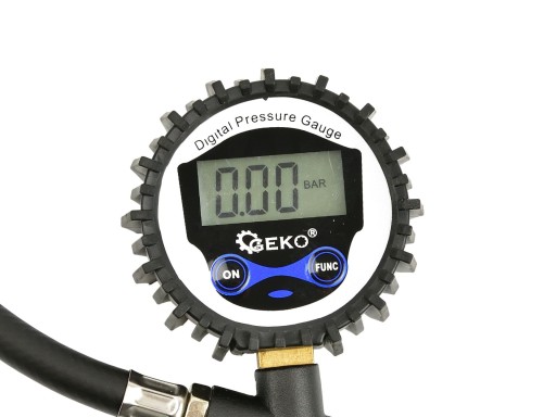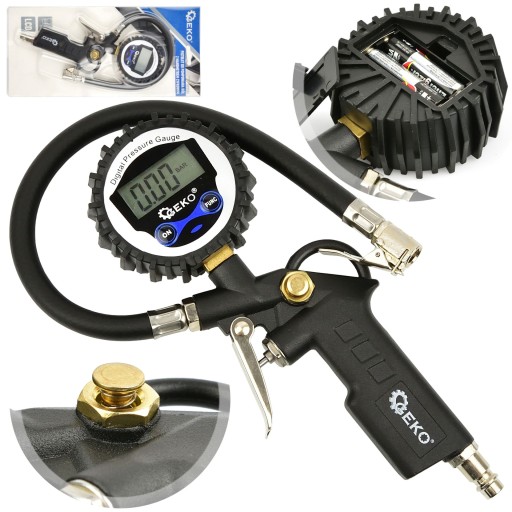 Profesjonalny pistolet pneumatyczny z manometrem LCD - do pompowania kół samochodów osobowych i ciężarowych. Wyposażony w elastyczny wężyk o długości 30 cm i duży czytelny manometr z wyświetlaczem LCD w gumowej osłonie chroniącej przed wstrząsami i uderzeniami . Skala pomiarowa w czterech jednostkach – Psi, Bar, kPa, Kg/cm2 . Szybkozłącze 1/4" pozwala na szybkie podpięcie do kompresora. Charakterystyka produktu: lekki i poręczny duży czytelny manometr z wyświetlaczem LCD skala 0 - 12 bar / 0 - 170 psi / 0 - 1200 kPa / 0 - 12,23 Kg/cm2 długość wężyka 30 cm metalowy korpus wyposażony w przycisk do upuszczania powietrza gumowa osłona manometru chroniąca przed wstrząsami i uderzeniami szybkozłączka 1/4" manometr zasilany przy pomocy dwóch baterii AAA (brak w zestawie) Specyfikacja techniczna: Średnica manometru: 63 mm Długość wężyka: 30 cm Ciśnienie maksymalne: 12 bar Skala pomiaru: 0 - 12 bar / 0 - 170 psi / 0 - 1200 kPa / 0 – 12,23 Kg/cm2