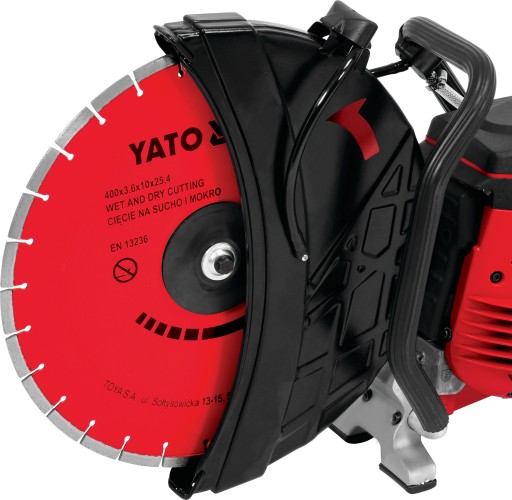 DANE TECHNICZNE:Symbol: YT-84820Seria: GRFObroty: 4700 min?1Moc: 4 kWPojemność silnika: 93.6 cm3Maks głębokość cięcia: 145 mmŚrednica tarczy: 400 mmŚrednica mocowania: 25.4 mmŚrednica wrzeciona: 14.3 mmŚrednica przyłącza wody: 1/2" (12.5 mm)Ciśnienie wody: 0.1-0.5 MPaPojemność zbiornika paliwa: 1 lProporcja paliwa i oleju: 40:1Maks zużycie paliwa: 2105 g/hChłodzenie: powietrzem (silnik), wodą (tarcza)Niskie drgania: takTyp świecy zapłonowej: L8RTF, BM6ALiczba cylindrów w silniku: 1Liczba taktów w silniku: 2Moment obrotowy mocowania tarczy: 15-25 NmMin średnica zewnętrzna kołnierza mocującego tarczę: 78 mmCiśnienie akustyczne: 93.35 ± 2.5 / 107.95 ± 2.5 dB(A)Moc akustyczna: 112.33 ± 2.5 / 115.5 ± 2.5 dB(A)Drgania: 6.99 ± 1.5 / 7.79 ± 1.5 / 10.26 ± 1.5 / 9.77 ± 1.5 m/s2Masa: 12 kgBardzo mocna dwusuwowa przecinarka przeznaczona do cięcia na sucho i mokro betonu oraz – przy zastosowaniu odpowiedniego rodzaju tarczy – asfaltu, kamienia i stali Rekomendowana dla profesjonalistów Do piły rekomendowane są tarcze: YT-5965 oraz YT-5955.wymagana średnica tarczy: 400 mm maksymalna głębokość cięcia: 145 mm moc: 5,44 KM chłodzenie tarczy wodąochrona przed pyleniem wielorowkowy pasek klinowy ceramiczna powłoka cylindra regulowana osłona tarczy pozwala na pracę w dowolnej pozycji element tnący zamontowany na amortyzatorach precyzyjne cięcie od biegu jałowego system odpowietrzania paliwa niski poziom wibracji regulacja strumienia wody wydmuch spalin w innym kierunku niż wydmuch pyłu zgodność z normą emisji spalin EURO 2 w zestawie przyłącze wody**