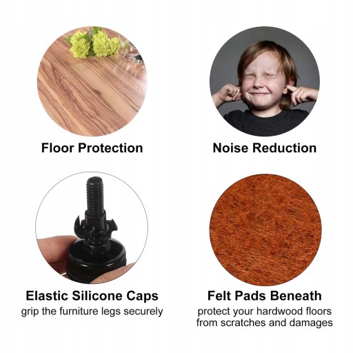 Niwelatory stołu wykonane są ze stali węglowej i tworzywa PP o maksymalnej odporności na korozję i trwałości, filcowe podkładki wykonane są z materiału filcowego, co gwarantuje wysoką wydajność. Łatwa instalacja, w przypadku istniejących nóżek meblowych z gwintem 3/8 cala-16 wystarczy wkręcić prostownicę do nóg, aby wyregulować wysokość.