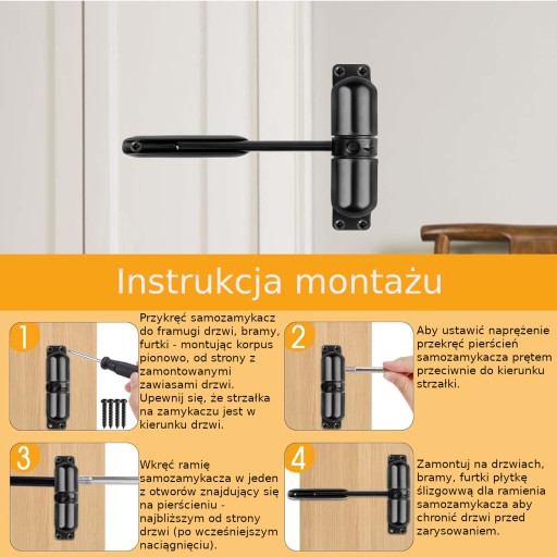 Przekręć pierścień naciągowy w stronę drzwi (przeciwnie do strzałki na korpusie samozamykacza) za pomocą stalowego pręta, będącego w zestawie. Przykręć ramię w otworze, który jest najbliżej drzwi. Żeby zwiększyć naprężenie, powtórz operację przesuwając tylko o jeden otwór. Żeby chronić drzwi, zamontuj płytkę ślizgową w odpowiednim dla ramienia miejscu