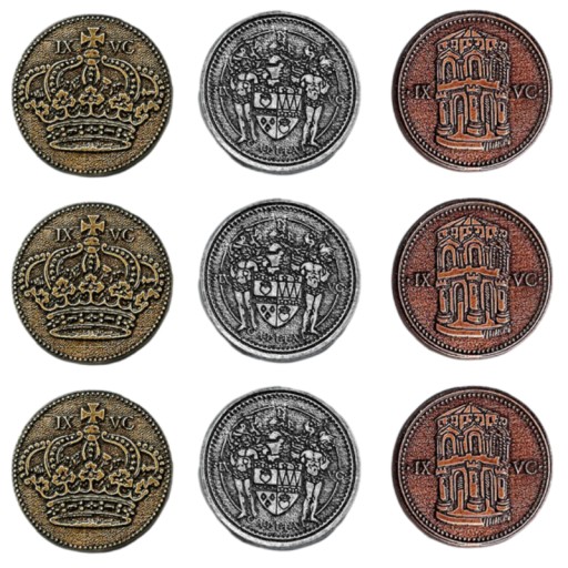 Wykonany ze stopów cynku zestaw 9 cudownych, ciężkich monet, które każdy feudalny władca chciałby wykorzystać w swoim królestwie.