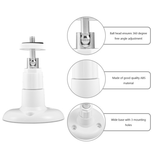 Cechy: Uchwyt wykonany jest z wysokiej jakości materiałów poddanych precyzyjnej obróbce, jest wytrzymały, odporny na starzenie i trwały. Z dużą podstawą do pewnego i stabilnego mocowania do ściany, może zapobiec upadkowi kamer. Obrotowa głowica o 360 stopni zapewnia elastyczną regulację kąta fotografowania aparatu. Pasuje do ścian wewnętrznych i zewnętrznych lub sufitów w każdym pomieszczeniu. Łatwy w użyciu i montażu. Przydatne akcesorium do instalacji kamer bezpieczeństwa. Specyfikacja: Materiał: ABS Kolor: Biały Ilość: 2 szt. Zakres regulacji kąta: Tilt-90 stopni; Pan-360 stopni Ładowność: ok. Rozmiar 1 kg (wysokość x średnica): ok. 9 x 7 cm / 3,54 x 2,76 cala Waga: ok. 89g Lista pakietów: 2 x uchwyty z mocowaniami