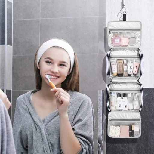 - Kosmetyczka posiada solidny haczyk, który umożliwia powieszenie przyborów toaletowych w kształcie wieszaka na ręczniki, wieszaka na ubrania i nie tylko.