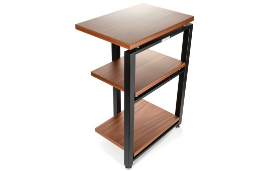 Stolik trójnożny, trzypoziomowy, z blatami grubości 30 mm pokrytymi naturalnym fornirem (mahoń sapeli). Stelaż balastowany jest piaskiem kwarcowym (zakręcane otwory umieszczone z tyłu nóg umożliwiają zmianę ilości oraz rodzaju balastu). Kolor stelaża - czarny (mat, drobna struktura).