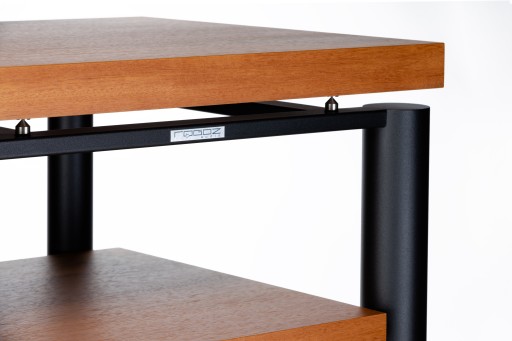 Stolik czteronożny, trzypoziomowy, z blatami pokrytymi naturalnym fornirem (merbau). Blat wierzchni optymalizowany dla gramofonów analogowych oraz źródeł cyfrowych. Stelaż balastowany piaskiem kwarcowym (zakręcane otwory umieszczone z tyłu nóg umożliwiają zmianę ilości oraz rodzaju balastu). Kolor stelaża - czarny (mat, drobna struktura).