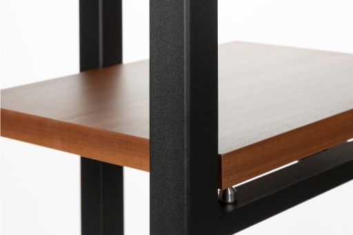 Stolik trójnożny, trzypoziomowy, z blatami grubości 30 mm pokrytymi naturalnym fornirem (mahoń sapeli). Stelaż balastowany jest piaskiem kwarcowym (zakręcane otwory umieszczone z tyłu nóg umożliwiają zmianę ilości oraz rodzaju balastu). Kolor stelaża - czarny (mat, drobna struktura).