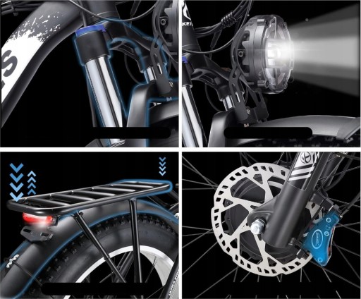 Rower elektryczny dla dorosłych jest wyposażony w opony 26 x 4,0 cala i nadaje się do jazdy po wszystkich rodzajach dróg, w tym górskich, zimowych i szosowych. Rower wyposażony jest w przedniego amortyzatora widelca, który sprawia, że dobrze radzi sobie na nierównych drogach. Rower jest również wyposażony w cztery tryby jazdy, podwójny olejowy układ hamulcowy i wysokiej jakości wyświetlacz LCD, który wyświetla informacje o czasie jazdy, takie jak wyłączenie paliwa i dystans.