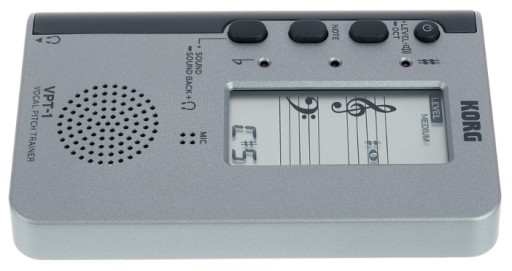 Gdy śpiewasz, KORG VPT-1 za pomocą wbudowanego mikrofonu precyzyjnie mierzy wysokość dźwięku i w czasie rzeczywistym pokazuje go na pięcioliniach, w kluczu wiolinowym i basowym. Indywidualne różnice w zakresie wysokości tonu głosu można wyrównać za pomocą funkcji przesunięcia oktawy, w celu dostosowania wykrytego zakresu w górę lub w dół, w krokach o jedną oktawę.