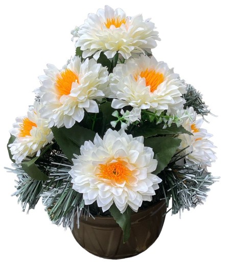Stroik bardzo trwały z kwiatów sztucznych ,wazon zalany betonem dzięki czemu jest stabilny.