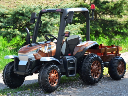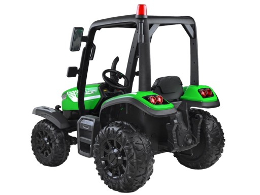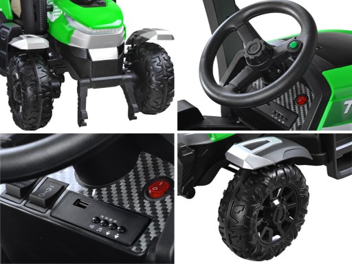 Dzięki 4 silnikom pojazd bez problemu poradzi sobie z pagórkami, nierównościami czy trawą. Włączenie prędkości pojazdu odbywa się za pomocą przełącznika na desce rozdzielczej (jazda wolna, szybka) oraz przy pomocy pilota 2,4Ghz, gdzie rodzic może ustalać prędkość pojazdu. Lewarek, który znajduje się po prawej stronie pozwala dziecku na przełączanie jazdy do przodu, stop, jazdy do tyłu. Światła w traktorze kierowca może włączyć za pomocą przycisku. Traktor posiada hamulec, działający po zdjęciu nogi z pedału gazu. Sprzęt wyposażony w panel muzyczny, klakson, kogut migający czerwonym światłem.