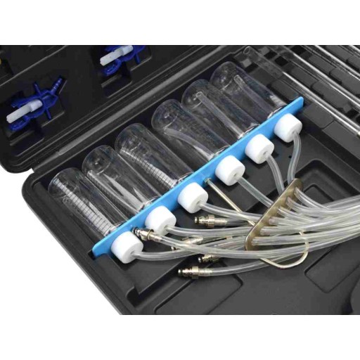 Zestaw do pomiaru przepływu paliwa na przelewach wtryskiwaczy Common Rail. Charakterystyka produktu do silników Common Rail pozwala na jednoczesny pomiar przepływu paliwa 6 wtryskiwaczy w zestawie 24 adaptery BOSCH-01, SIEMENS-02, DENSO-03 oraz DELPHI Elementy zestawu 6 szt menzurek dużych z wężykami z końcówkami do systemu Bosch 6 szt menzurek małych do systemu Bosch 6 złączek do systemów Delphi 6 złączek do systemów Denso 6 złączek do systemów Siemens 6 złączek do systemów Bosch