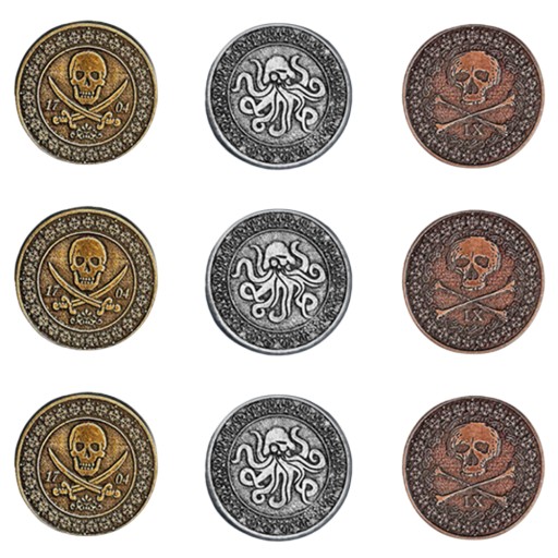 Wykonany ze stopów cynku zestaw 9 cudownych, ciężkich monet, który zdobyliśmy wychodząc zwycięsko ze starcia z Czarnobrodym!