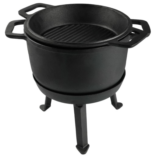 Kociołek wyposażony jest w solidną pokrywę z funkcją patelni grillowej oraz stojak z trzema stabilnymi nóżkami.