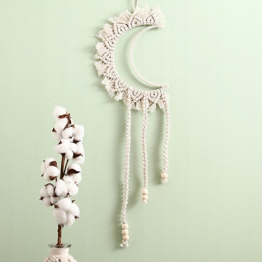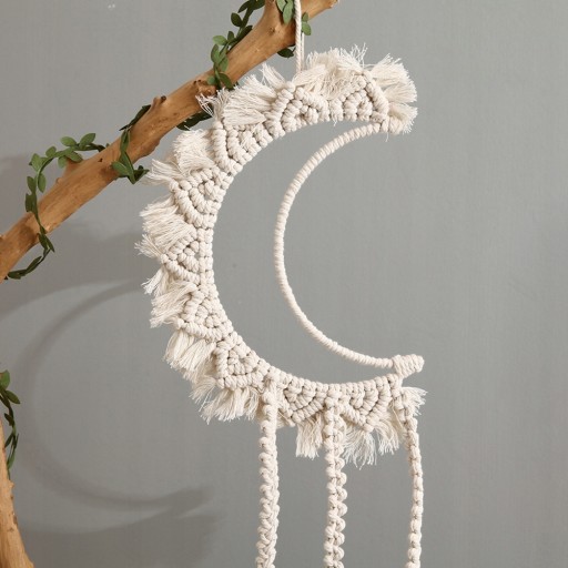 Jest to ręcznie tkana dekoracja wisząca łapacz snów. Unikalny wzór w kształcie księżyca z pomponem jest atrakcyjną dekoracją ścienną. Ta zawieszka na ścianę łapacza snów doskonale nadaje się do wystroju domu, wesela, przyjęcia zaręczynowego, sypialni dla dzieci, balkonu itp.