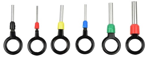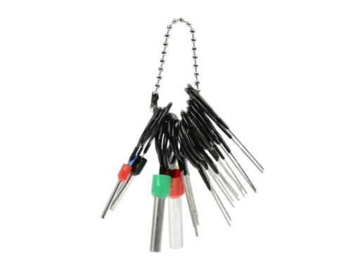 Komplet składający się z 38 kluczy przeznaczonych do demontażu konektorów oraz pinów. Zestaw szczególnie przydatny podczas wykonywania napraw instalacji elektrycznej w samochodach, motocyklach, a także w sprzęcie AGD/RTV. Klucze w znacznym stopniu ułatwiają wypinanie przewodów z gniazd.
