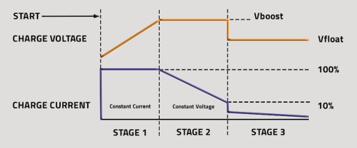- Etap FLOAT to ostatni cykl ładowania, tak zwane podtrzymanie w którym akumulator osiągnął już 95% pojemności i stopniowo osiąga 100%, następuje zmniejszenie napięcia ładowania do stałej wartości pomiędzy 13.0VDC a 13.8 VDC, prąd ładowania automatycznie spada do 0A po naładowaniu akumulatora.