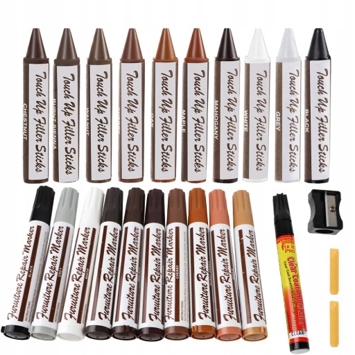 - SPECYFIKACJA: ilość kolorów: 10: czarny, szary, biały, mahoń, klon, dąb, czereśnia, orzech, palona sjena, kasztan + bezbarwny; rodzaj: markery + woski; materiał: tworzywo sztuczne; wymiary markera: 13,5/2/2cm; wymiary kredki: 7/1,3/1,3cm; waga: 0,295kg; waga w opakowaniu: 0,304kg.