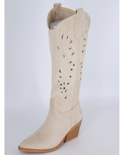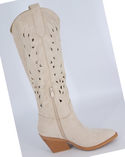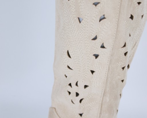 DŁUGIE KOWBOJKI AŻUROWE DAMSKIE KOZAKI Z ZAMSZU BEŻOWE