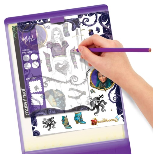 Ten podświetlany stół do rysowania i kalkowania uwolni kreatywność Twojego dziecka, gdy zaprojektuje modę inspirowaną filmem Disneya Descendants 3.Ten zestaw do rysowania zawiera wszystko, czego Twoje dziecko potrzebuje, aby rozpocząć przygodę z projektowaniem mody. Zawiera podświetlany stolik, szkicownik z przewodnikiem po projektowaniu i naklejki.