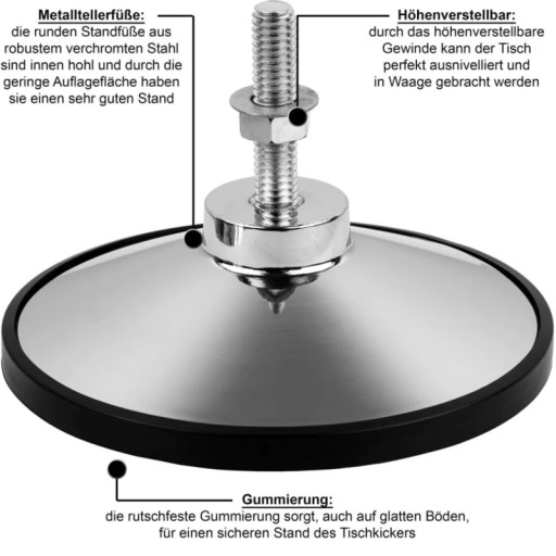 Model "PRO" serii TUNIRO ma masę 110 kg i jest wyposażony w gumowane nóżki z regulacją wysokości Uchwyty są doskonale ergonomiczne, pozostają antypoślizgowe nawet dla pocącej się dłoni Pręty do gry są bezpieczne - zapobiegają przypadkowemu zaciśnięcia palców pomiędzy rączką a krawędzią stołu W celu wyeliminowania wgniecenia boiska zbudowanego na twardym podłożu o grubości 24 mm - dodatkowo wzmocniono pole gry żelazną kratownicą od spodu Okrągłe metalowe nogi są wydrążone w środku, mimo niewielkiej powierzchni nośnej posiadają bardzo dobrą stabilność.