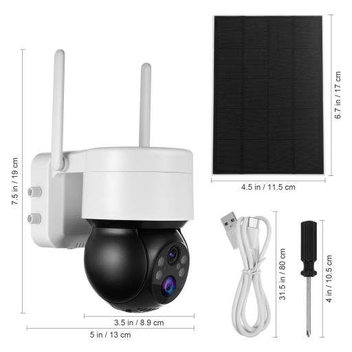 ✅1 x kamera 1 panel 1x przedłużacz 1 x stojak 2 x zestawy śrubek (4 w opakowaniu) 1 x śrubokręt 4 x stała klamra obrotowa 1 x kabel USB 1 x instrukcja obsługi 1