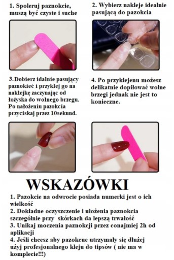Można również przykleić paznokcie na profesjonalny klej do tipsów ( nie ma w zestawie!!!) co przedłuży ich trwałość.